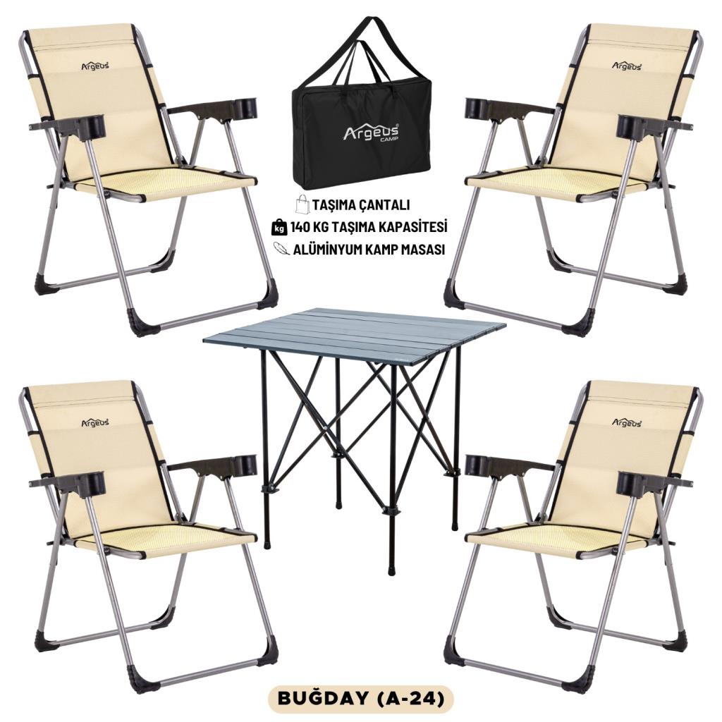 4 Adet Katlanır Kamp Sandalyesi ve Alüminyum Masa Seti - Rock Dark - Buğday - Taşıma Çantalı