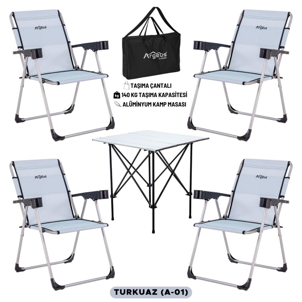 4 Adet Katlanır Kamp Sandalyesi ve Alüminyum Masa Seti - Rock Silver - Turkuaz - Taşıma Çantalı