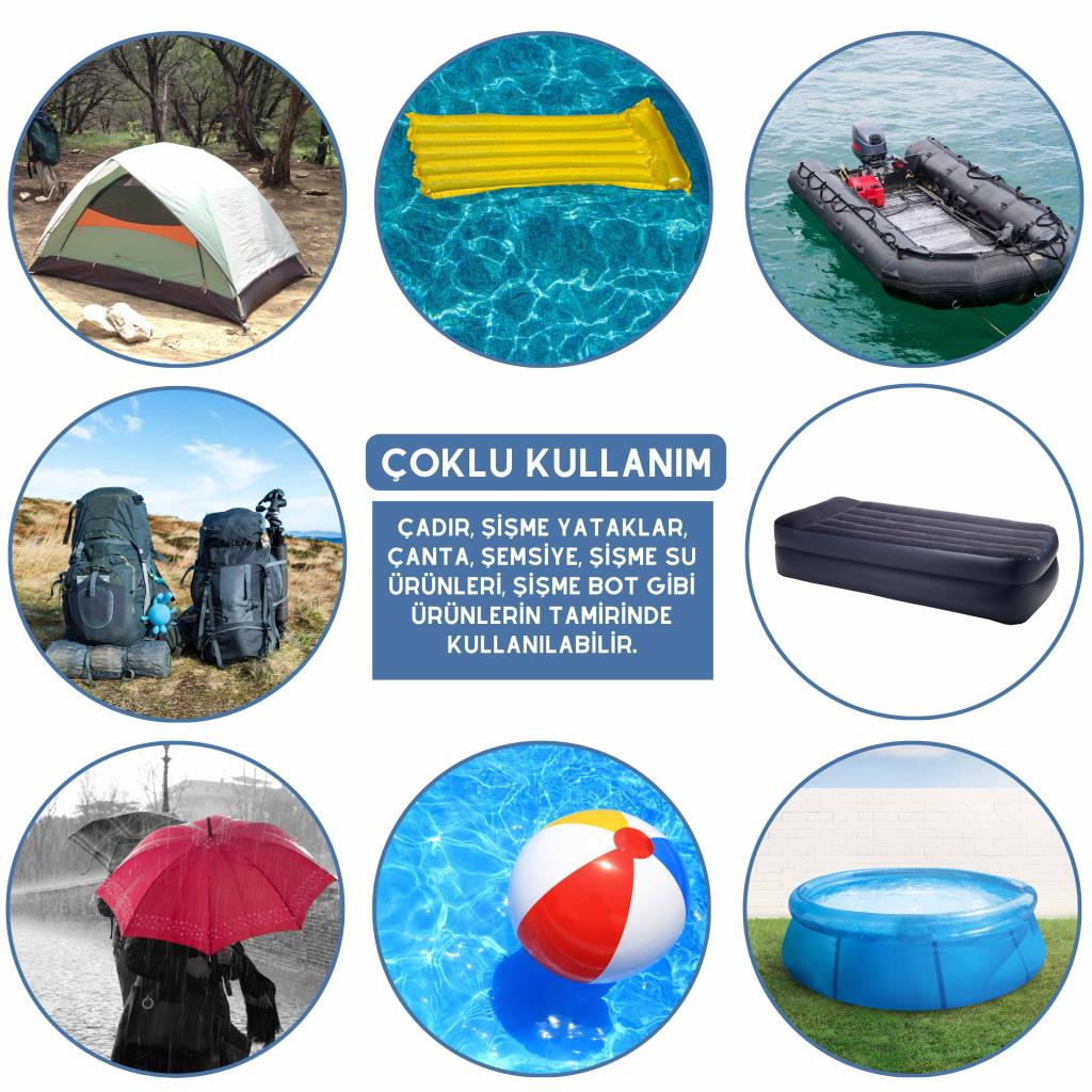 Bu yüksek kaliteli tamir seti, çadırlarınızdan şişme botlara, şişme yataklardan oyuncaklara, ceketlerden şemsiyelere ve sırt çantalarına