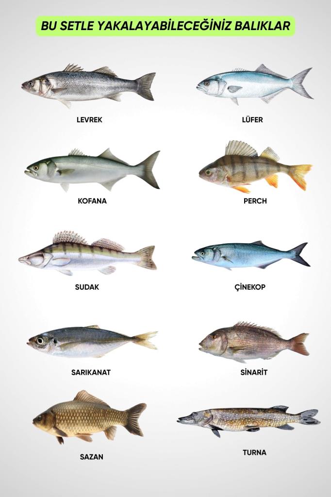- Levrek, turna, alabalık, istavrit, çinekop ve diğer birçok balık türü