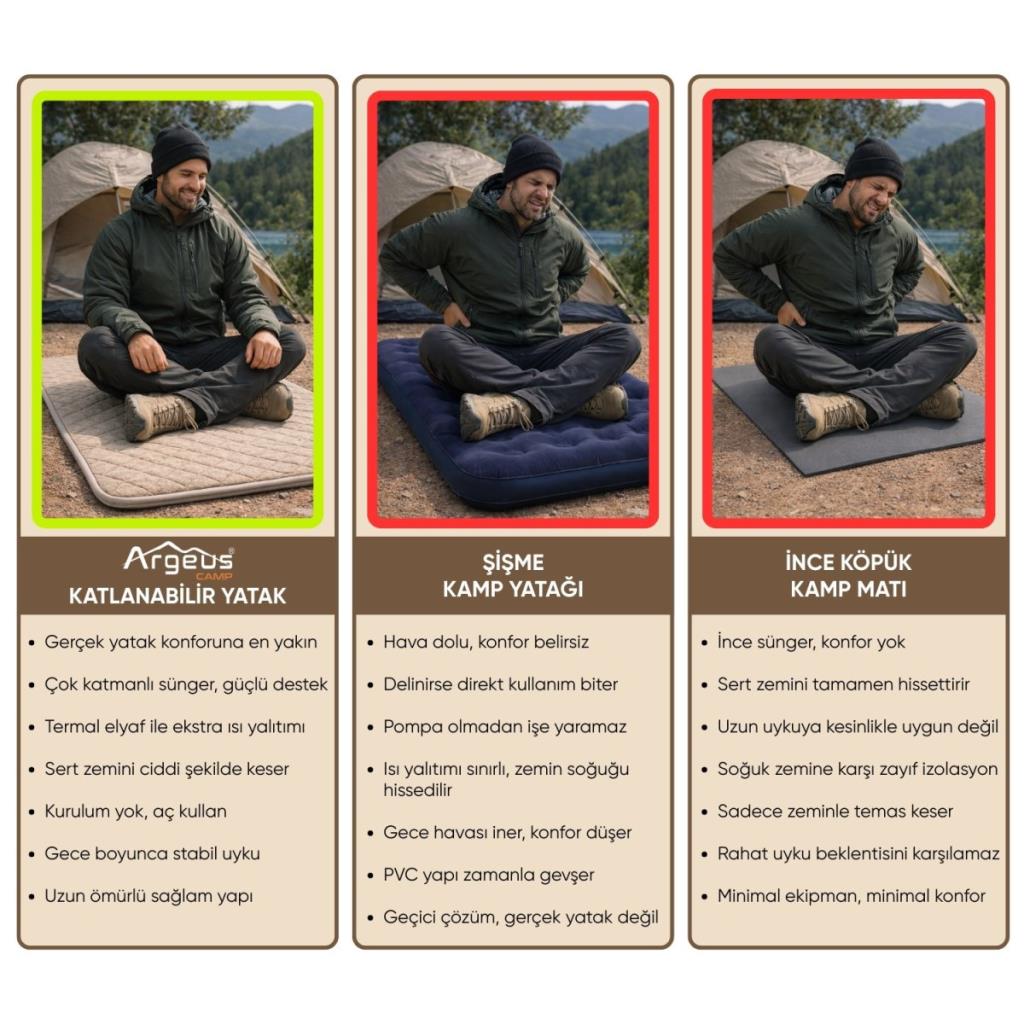 Argeus Katlanır Kamp Yatağı, dayanıklı dış kumaşı ve çok katmanlı sünger yapısı sayesinde outdoor konaklamalarda zeminden gelen sertliği azaltarak konforlu bir uyku alanı sunar. Katlanabilir yapısı ve taşıma sistemi ile kamp ekipmanları arasında pratik bir çözüm oluşturur. Doğru ekipman, keyifli kamp.