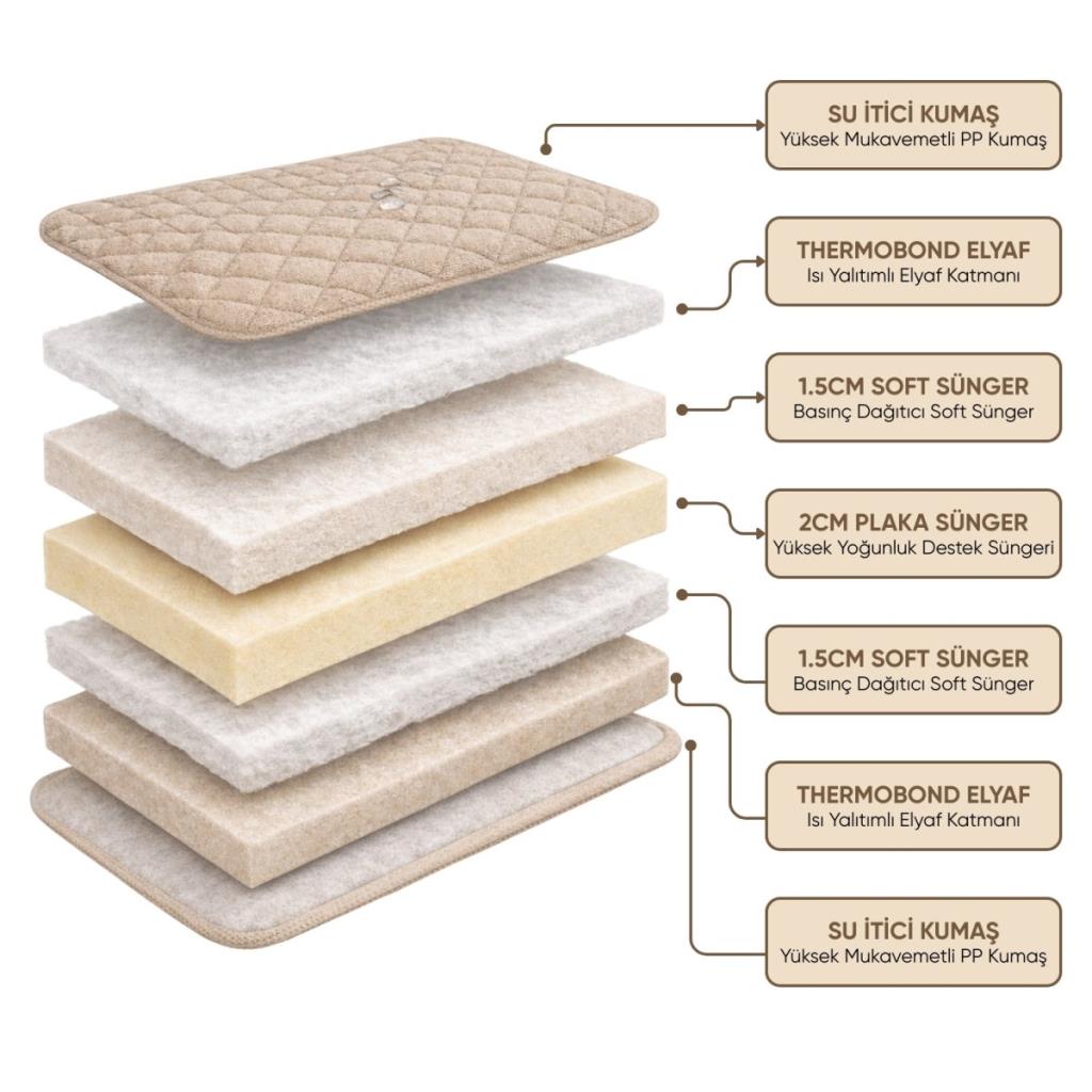 İç katman yapısı konforu artırmak için çok katmanlı olarak tasarlanmıştır. Thermobond elyaf, 1,5 cm soft sünger, 2 cm plaka sünger ve tekrar soft sünger katmanlarıyla toplam 6 cm kalınlık oluşturulmuştur. Bu yapı, vücut ağırlığını dengeli şekilde dağıtarak sert zeminlerde daha konforlu bir uyku yüzeyi sağlar. Uzun süreli kullanımlarda sünger yapısının çökmesini engelleyen yoğunluk dengesi sayesinde yatış konforu korunur.