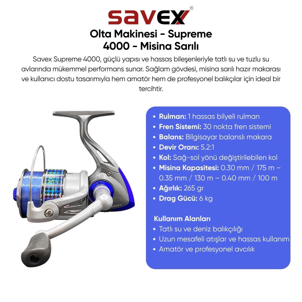 - Hazır Kullanım: Misina sarılı Savex Supreme 4000 olta makinesiyle anında avlanmaya başlayın.
