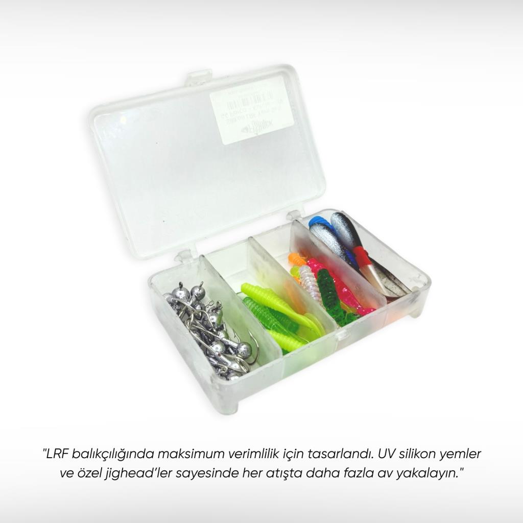 Farklı boy, renk ve aksiyon seçenekleriyle zenginleştirilmiş bu özel set, toplam 44 parçadan oluşur. Yumy serisi silikon kurt yemleri, Fishack Wormix serisinin farklı renk ve boylardaki modelleri ve Dolphin Rock kurbağa silikon yemleri ile LRF avcılığında farklı bir deneyim sunar. Set içindeki jighead (zoka) modelleri yemlere özel ağırlık ve denge ayarıyla tasarlanmış olup, 3 g, 4 g ve 6.5 g seçenekleriyle yemlere mükemmel aksiyon kazandırır. Tüm ürünler pratik kullanım için 4 bölmeli şeffaf saklama kutusu ile birlikte sunulur.
