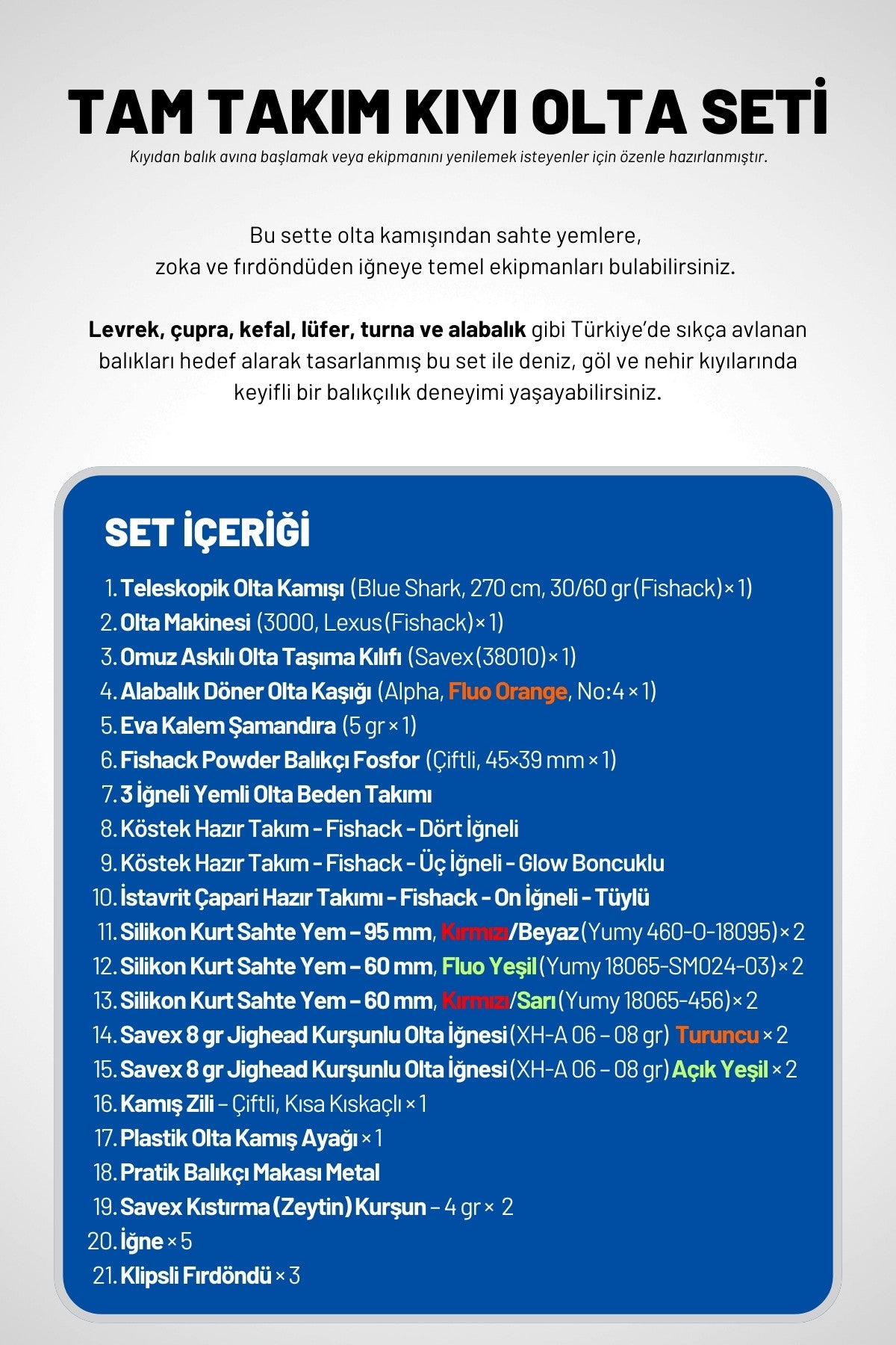 Tam Takım Kıyı Olta Seti, kıyıdan balık avına başlamak isteyenler veya ekipmanını yenilemek isteyen deneyimli balıkçılar için özenle hazırlanmıştır. İhtiyacınız olan tüm temel ekipmanları bir araya getiren bu set, deniz, göl ve nehir kıyılarında levrek, çupra, kefal, lüfer, turna ve alabalık gibi Türkiye’de sıkça avlanan balıkları hedef alarak tasarlanmıştır.