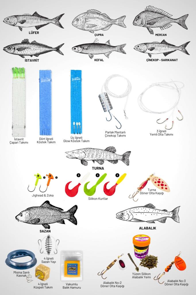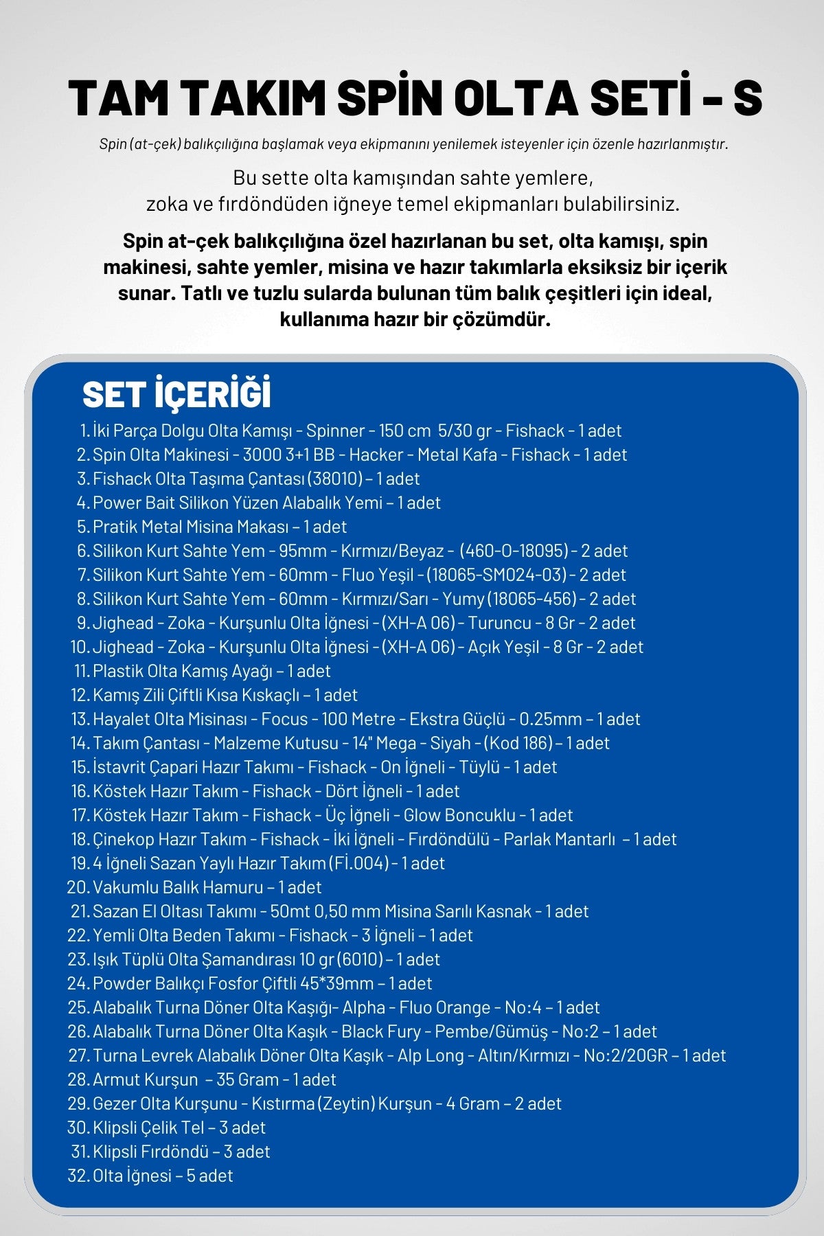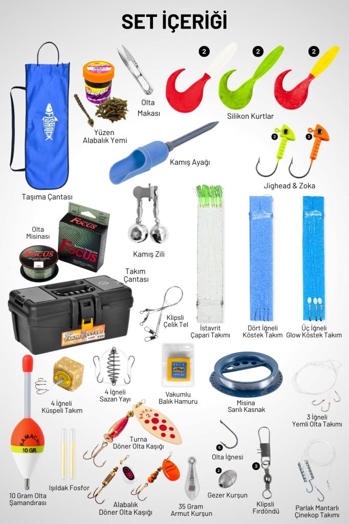 Fishack Tam Takım Spin Olta Seti, spin (at-çek) balıkçılığına başlamak veya ekipmanını yenilemek isteyenler için özenle hazırlanmıştır. Toplam 47 parçalık içeriğiyle hem tatlı hem de tuzlu sularda kullanılabilecek eksiksiz bir çözümdür. Olta kamışı, spin makinesi, silikon yemler, misinalar, hazır takımlar ve yardımcı aksesuarlar gibi temel ve ileri seviye malzemeleri bir arada sunar. Farklı balık türlerine yönelik olarak hazırlanmış içeriği sayesinde levrek, turna, alabalık, çinekop ve sazan için idealdir. Dayanıklı taşıma çantası ve pratik takım kutusuyla birlikte her seviyeden balıkçı için kullanıma hazırdır.